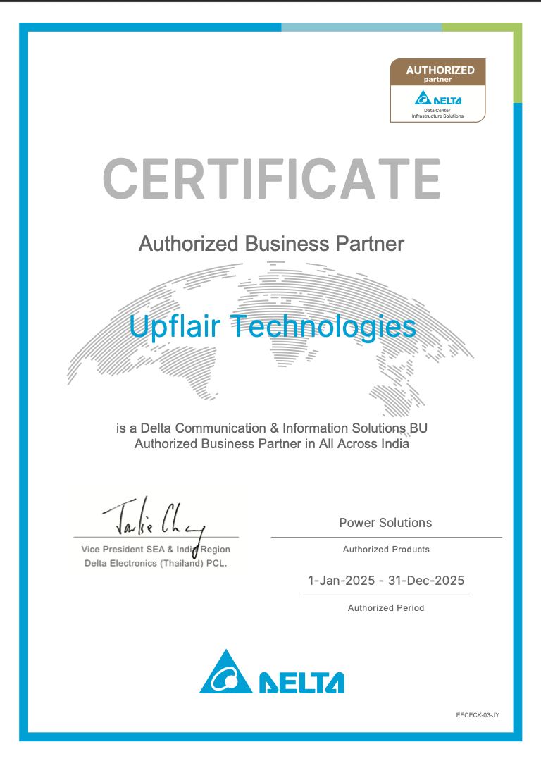 Upflair Technologies is an authorized business partner of Delta Electronics PCL, a global leader in power solutions. As part of this partnership, Upflair Technologies is authorized to provide Delta’s energy-efficient power solutions across India from January 1, 2025, to December 31, 2025.